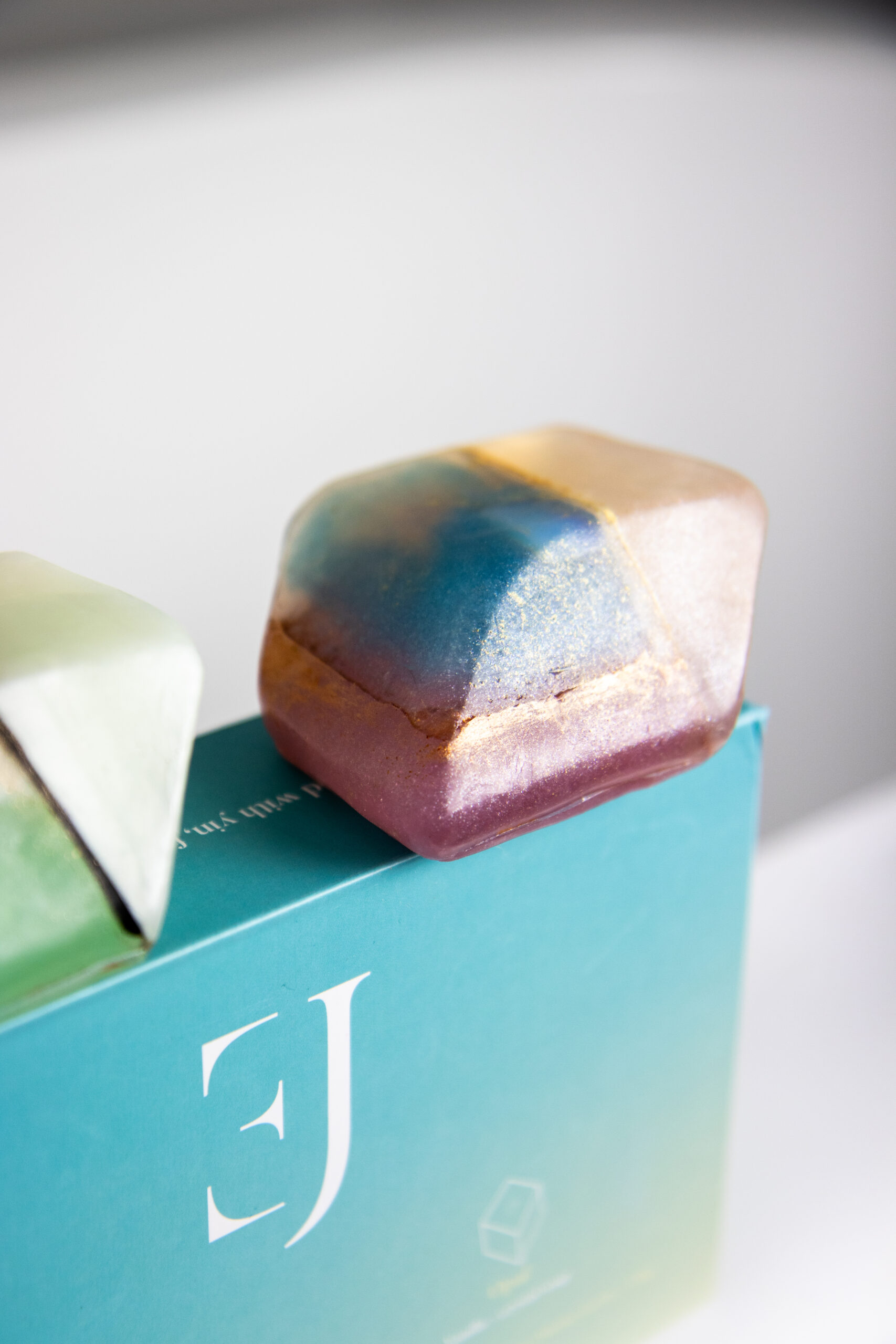 Un duo tout en douceur et en lumière, symbole d’apaisement et d’équilibre intérieur. Chaque savon est taillé à la main comme un cristal, et renferme un petit minéral véritable en son cœur.
