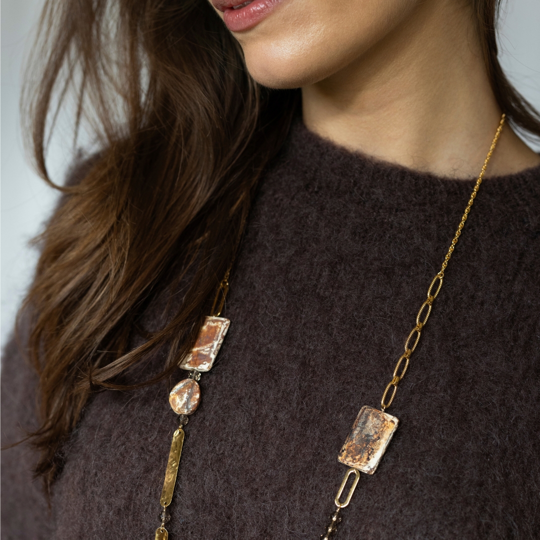 Le Léana joue avec les volumes et les textures : pierres facettées, maillons sculptés et éclat doré composent un sautoir au caractère affirmé. Long et fluide, il habille la silhouette d’une ligne élégante qui attire discrètement la lumière. Un bijou de tempérament, facile à porter au quotidien comme sur une tenue plus habillée — toujours avec cette touche sensible et moderne propre à Camille H.